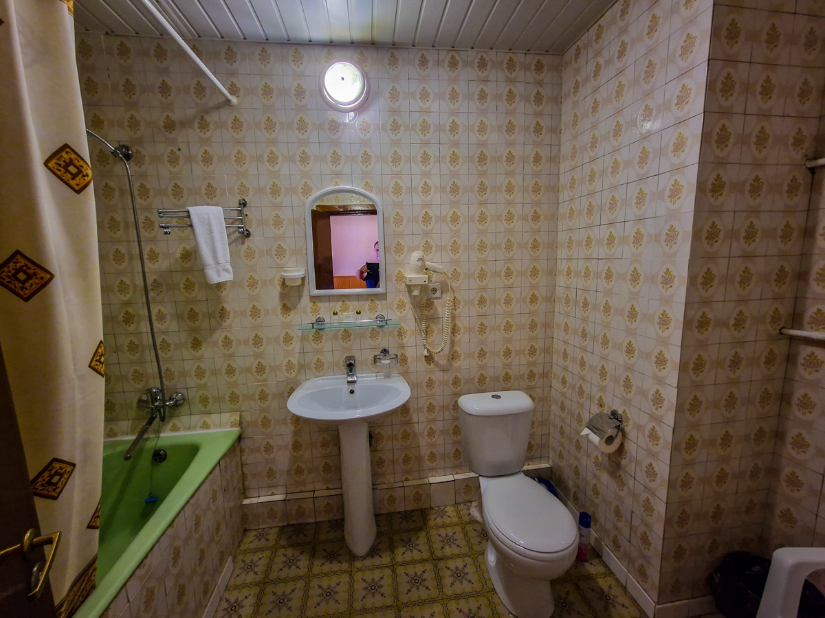 Совмещенная туалетная комната оформлена в приятных тонах, в ней царит атмосфера чистоты и свежести. В уборной можно принимать душ и ванну, умываться и проводить любые водные процедуры. Там также находятся раковина с зеркалом, унитаз, полотенца и другие банные принадлежности.