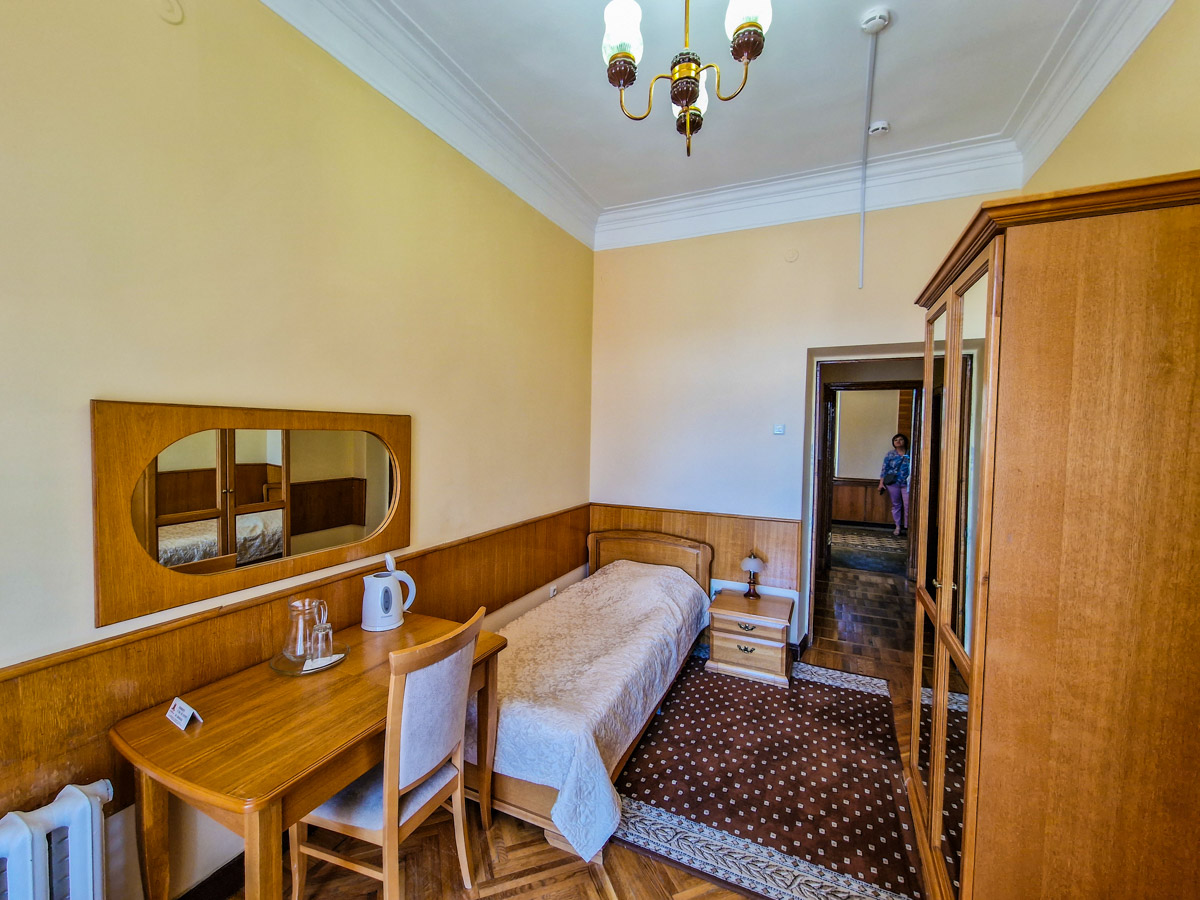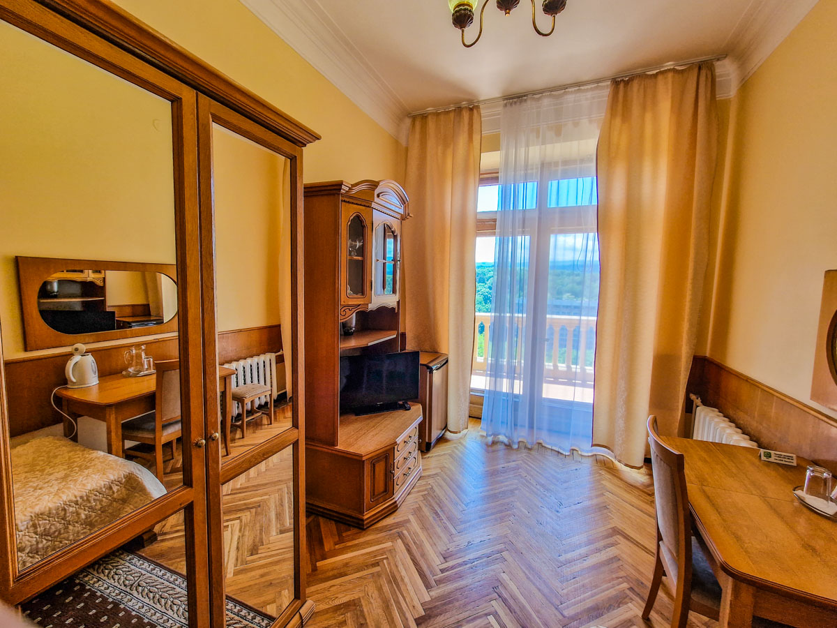 По-домашнему уютный номер «1-местный» санатория им. Орджоникидзе в г. Кисловодске на одного человека позволит в полной мере насладиться покоем и комфортом. Просторная удобная кровать подарит крепкий сон, а расширенная комплектация апартаментов позволит с удовольствием проводить досуг. В комнате есть телевизор, а также все необходимое для чаепития и перекусов в любое время: шкаф-сервант с посудой, холодильник, электрочайник и обеденный стол со стулом.